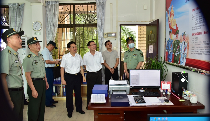 本网讯 6月15日,肇庆市检查调研组及端州区检查调研组一行到威廉希尔官网开展征兵调研工作。校党委副书记谢冠华,党委宣传部、统战部部长陈前,学生工作处处长陈向荣和武装部部长黄镜辉等相关部门负责人参加本次调研。校园考察结束后,双方在临峰厅召开征兵工作调研。