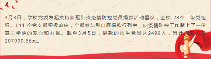 学生党员在这次捐款活动中同样令人感动。有些同学既以志愿者的身份投身家乡所在地的疫情防控工作,又积极参加所在学院的捐款活动。来自体育与健康学院2017级体育教育1班的李芷倩同学就是其中之一,她说:“能够为疫情防控贡献一点点力量,感到很光荣。” 有些同学家庭本来比较困难,但是也在捐款活动中献出了爱心。来自机械与汽车工程学院的2016级机械专业的翁楚财同学就是这样,这名在过去几年连续获得国家励志奖学金的学子说:“个人的力量非常有限,但我们每个人都行动起来,力量就大了。”有些同学今年准备毕业,听到学校组织捐款的消息,二话没说就进行了捐款。文学院2016级秘书班的李银涵同学就是如此,她说:“感谢母校这些年的培养。我捐得很少,但这是我的一点心意,向所有坚守在疫情防控一线的英雄致敬。”有些同学们平时省吃俭用,这次捐款的数额却比较大。政法学院2017级法学专业的赖泳洇同学就是一个突出代表,捐出300元的她说:“一方有难,八方支援。我是一名学生党员,尽力去帮助别人是应该的。”砚园学子在抗疫斗争中体现了当代大学生的爱国情怀和使命担当。