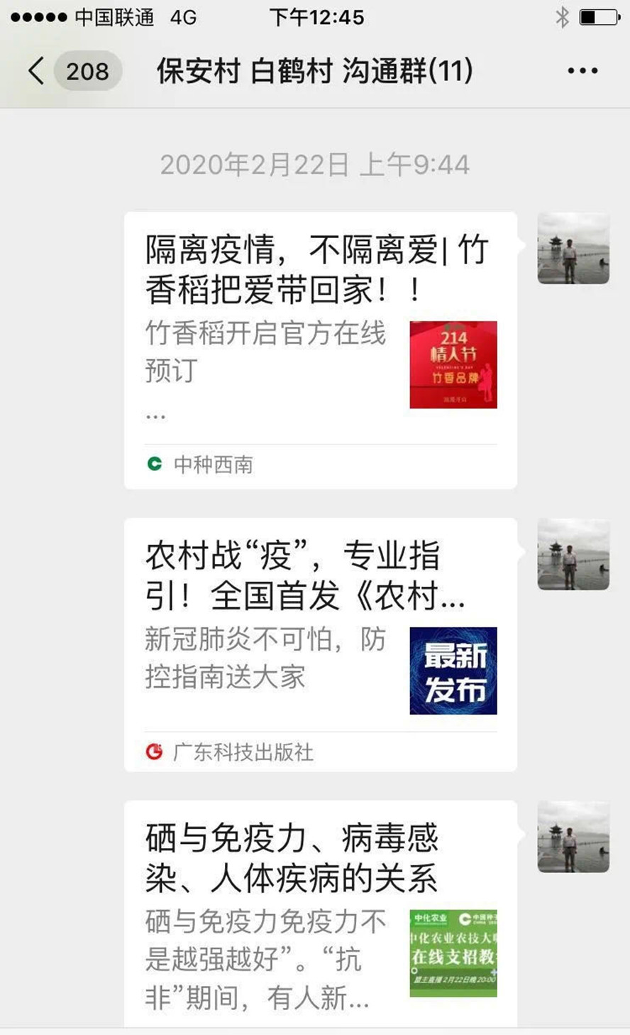 富硒技术团队通过微信及时发放富硒水稻种植的培训资料,并通过微信传发硒与免疫力、病毒感染和人体疾病的关系等知识。该团队带头人张宝杰教授在跟村民沟通时表示,人类跟疾病较量,最关键的地方还是提高人体免疫力,富硒农产品恰恰具有这样的辅助功能。得益于他的介绍,村民种植富硒水稻的热情大大提升。