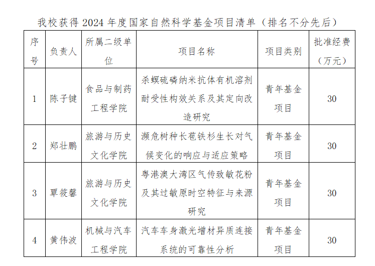 本网讯 近日,国家自然科学基金委员会公布了2024年度国家自然科学基金项目的评审结果,威廉希尔官网获批青年科学基金项目4项,直接经费共120万元。