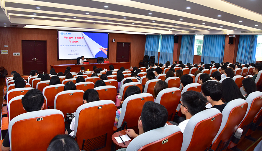 谢冠华作了题为《不负韶华 不负青春 不负时代——学习〈习近平谈治国理政〉第三卷》的专题辅导。他深入解读了《习近平谈治国理政》第三卷的时代背景、理论意义和实践意义,并结合习近平总书记给青年大学生的四封回信,阐明了中国青年引领时代进步潮流的时代精神,又从党所确立的中国道路、中国理论、中国制度、中国文化等方面剖析了“中国共产党为什么能”这个时代命题,勉励同学们坚定理想信念,树立远大目标,加强学习实践,提高思想认识,做到热爱党、热爱祖国、热爱人民,勇于担当时代先锋和工作责任,不忘初心,砥砺奋进,炼就过硬本领,锤炼品德修为,争当新时代的中国好青年,为实现中华民族伟大复兴的“中国梦”贡献力量。