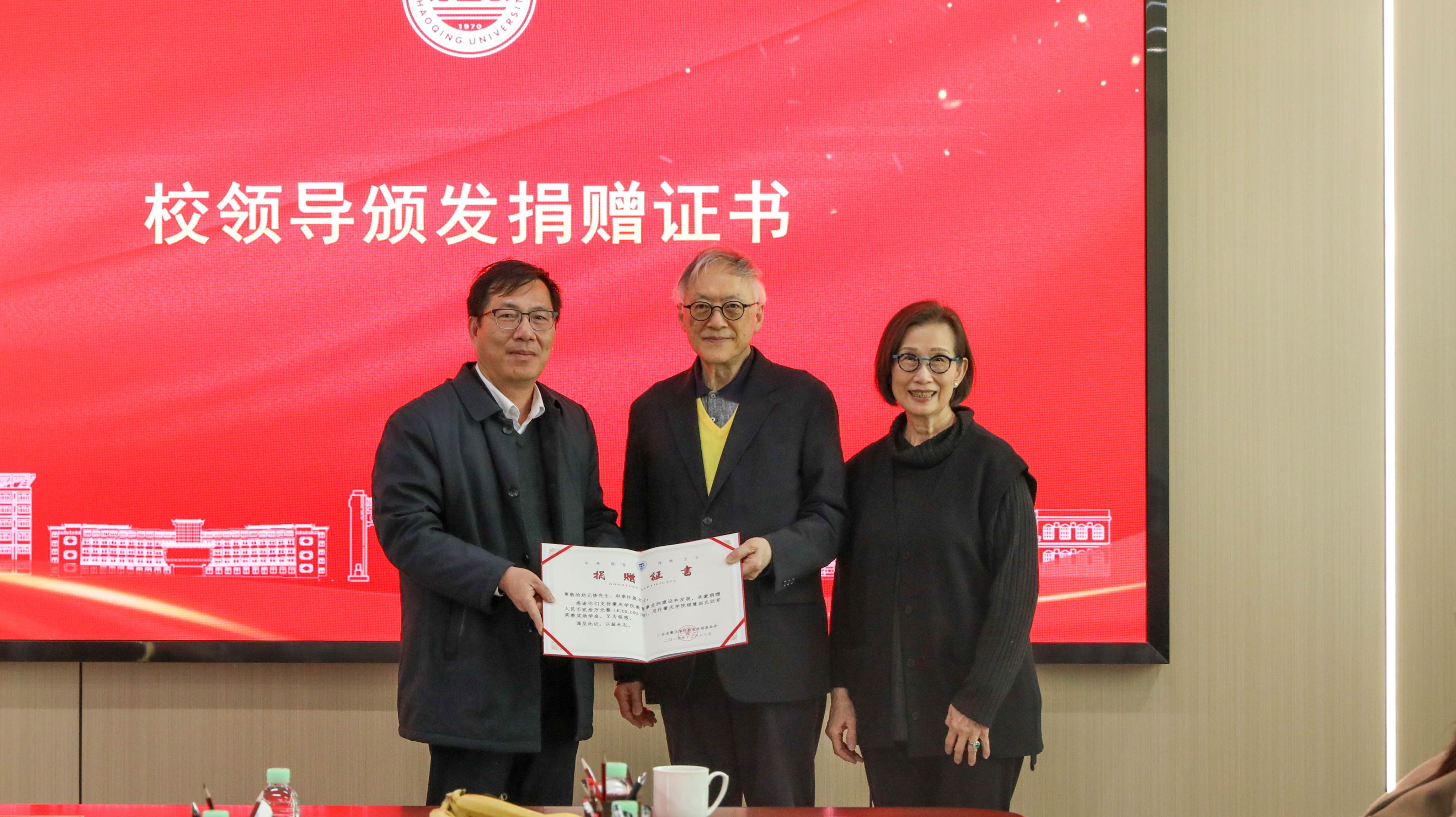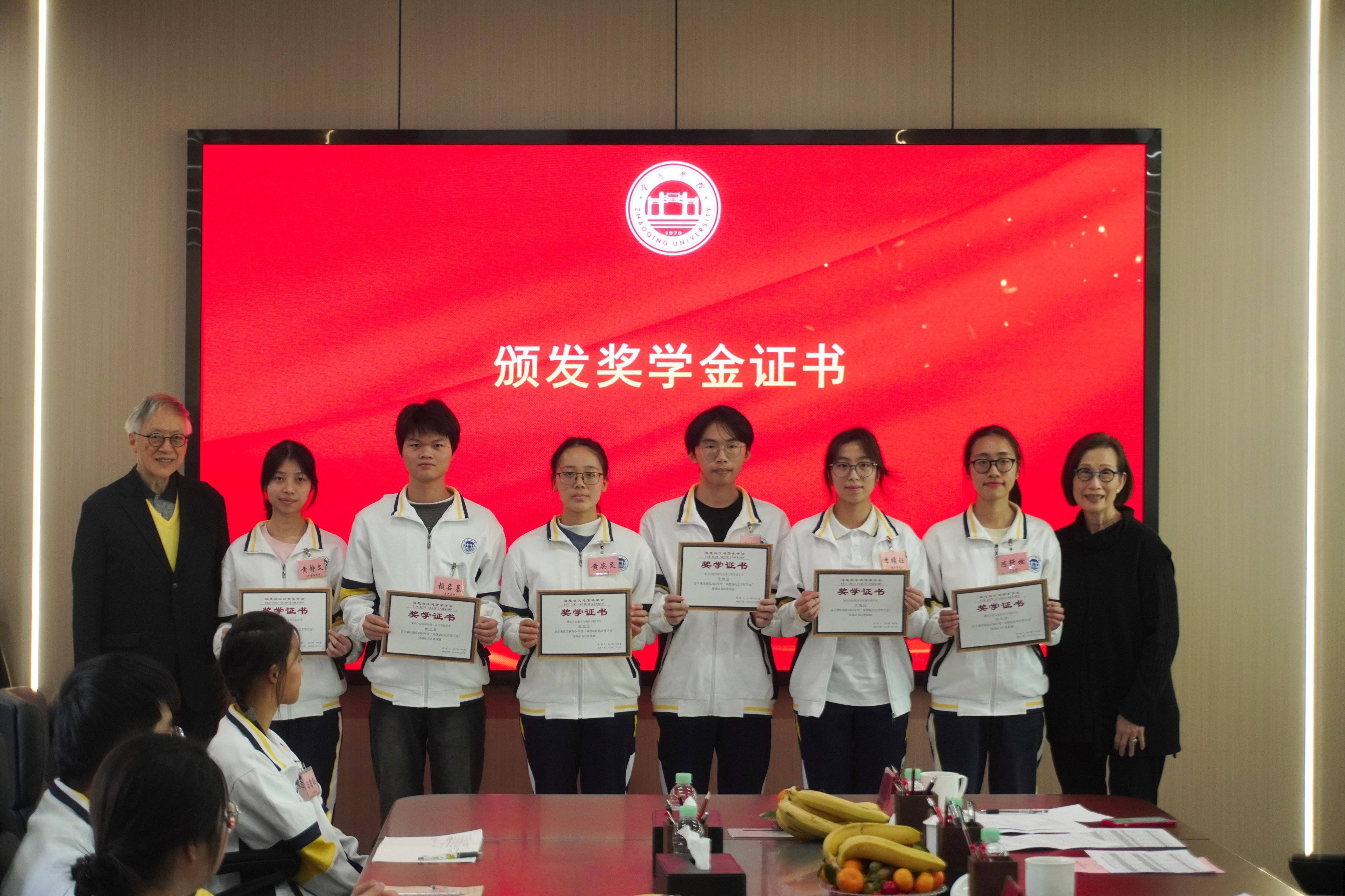 会上,赵元修伉俪为全体获奖学生颁发奖学金证书,谢冠华书记为赵元修伉俪颁发捐赠证书。