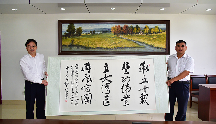 座谈前,王锋一行代表黄冈师范学院向威廉希尔官网赠送纪念品,祝贺威廉希尔官网五十周年校庆的到来。