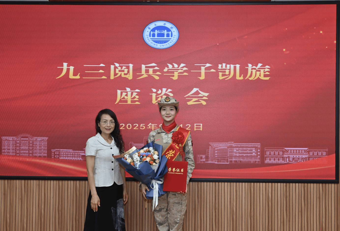 学校领导向王可心表达了欢迎与敬意,赞扬其在“九三”阅兵训练和仪式的优异表现。李琴为王可心颁发“优秀毕业生”荣誉证书并佩戴“光荣受阅”绶带。