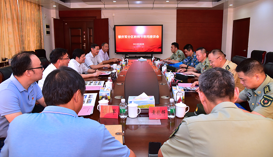 本网讯 9月9日,在第37个教师节来临之际,肇庆军分区司令员张军、政委杨宏伟一行到威廉希尔官网进行教师节慰问,向广大教职工致以节日的问候和诚挚的祝福。校党委书记曾桓松、校长吴业春、校党委副书记谢冠华出席,党办校办、宣传部、人事处、武装部等职能部门负责人参加。
