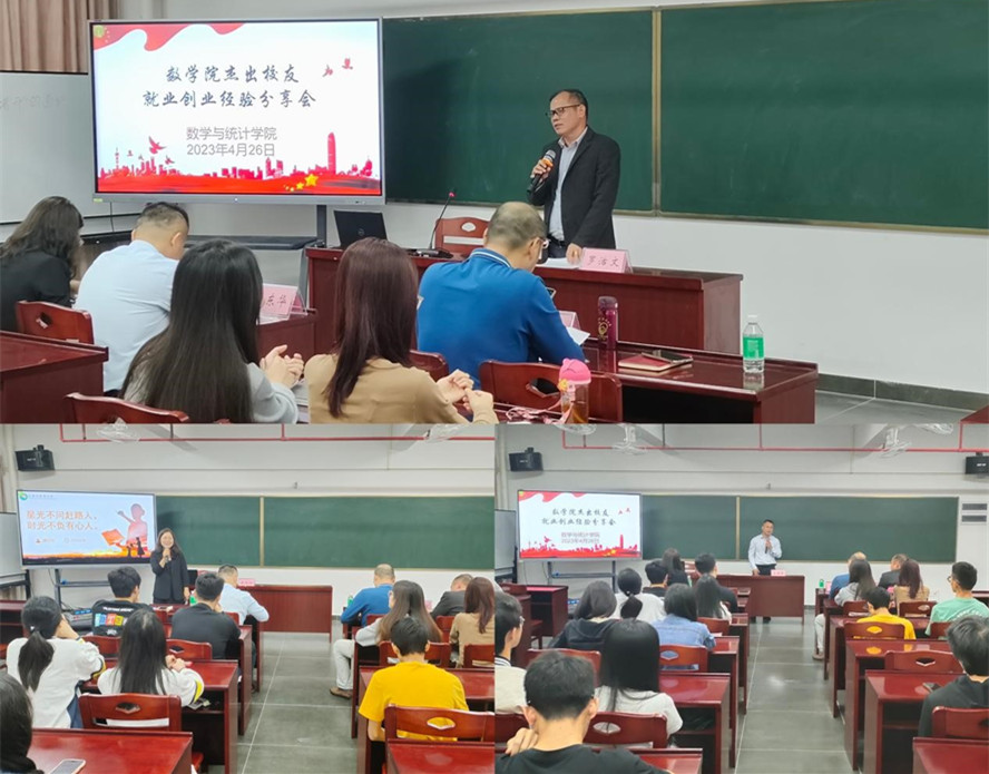 本网讯 4月26日,数学与统计学院在实训中心214举行以“就业创业经验分享”为主题的交流会,1988届校友、williamhill威廉希尔官网东莞校友会常务副会长、数学院东莞校友会会长罗活文,1995届校友、数学院东莞校友会副会长区东华,2011届校友、东莞市麻涌中学高中数学一级教师潘巧玲出席,分享交流会由学院党委书记杨帆主持。