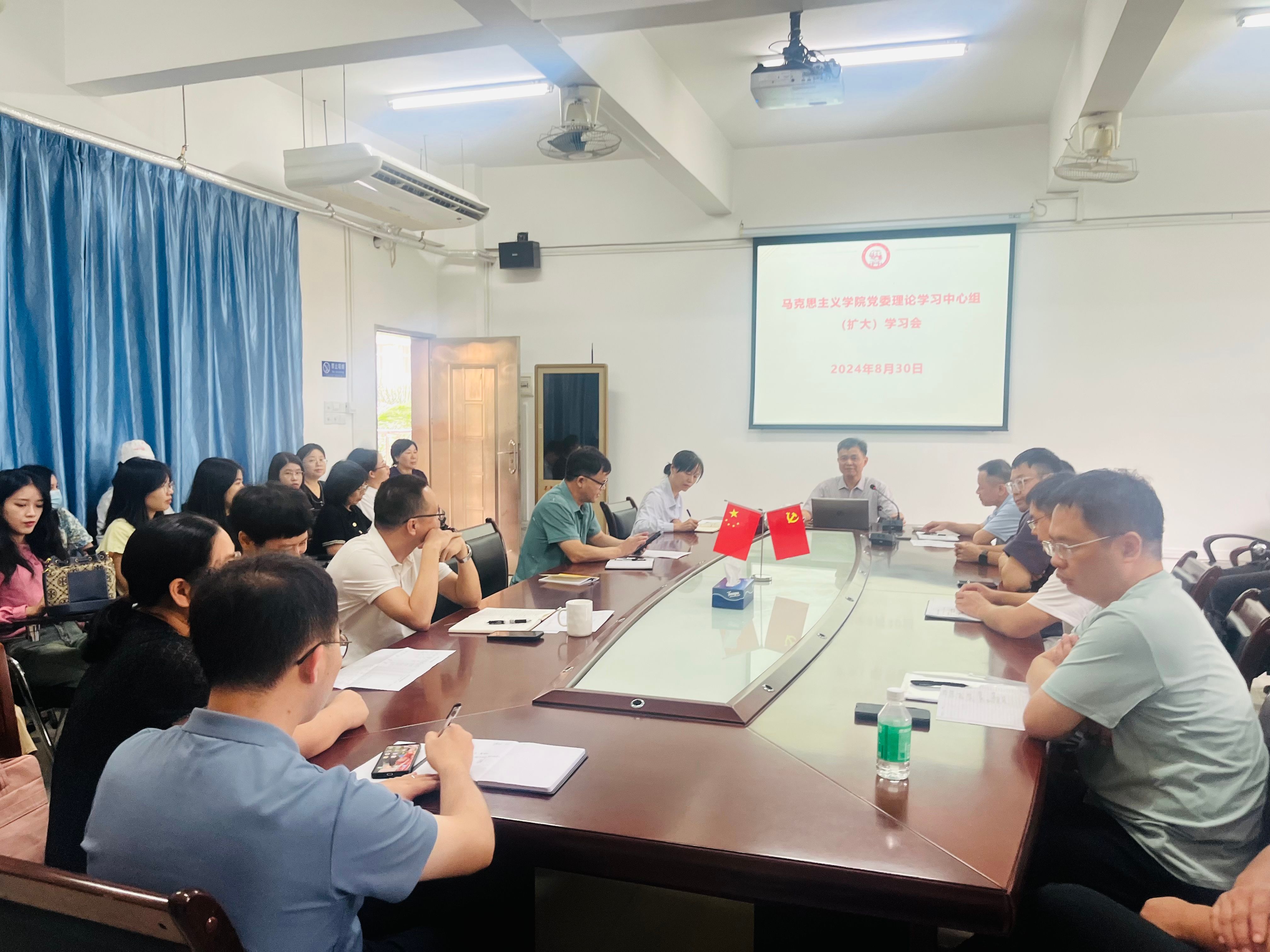 本网讯 8月30日,马克思主义学院党委在三教317会议室召开理论学习中心组(扩大)学习会,学习贯彻党的二十届三中全会精神。会议由马院党委书记侯玉基主持并讲授专题党课,马院全体领导及教职工参加。
