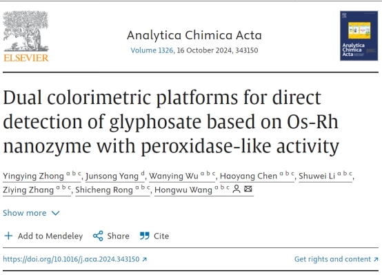近期,食品与制药工程学院、农业农村部农产品质量安全风险评估实验室(肇庆)汪洪武教授团队取得了重要科研突破。其最新研究成果“Dual colorimetric platforms for direct detection of glyphosate based on Os-Rh nanozyme with peroxidase-like activity”在国际化学及分析化学领域的知名学术期刊“Analytica Chimica Acta”上发表。该论文以williamhill威廉希尔官网为第一完成单位,汪洪武教授担任通讯作者,钟颖颖教师为第一作者。论文的DOI号为:10.1016/j.aca.2024.343150。