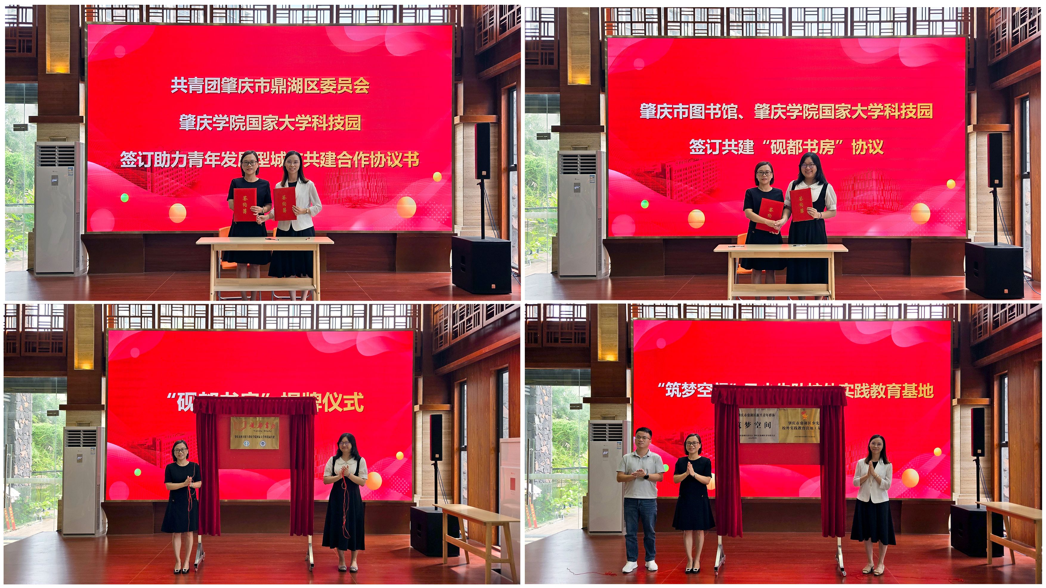 活动现场,大学科技园与肇庆市图书馆、共青团肇庆市鼎湖区委员会分别签订“砚都书房”和助力青年发展型城市共建合作协议书,各方代表为“砚都书房”“筑梦空间”“少先队校外实践教育基地”揭牌。大学科技园鼎湖分园运营一年多以来,会同肇庆各县市区及市直等多个部门举办了20余场活动,此次与肇庆市图书馆联合共建“砚都书房”,打造集文化展示、创意交流于一体综合性文化空间;与鼎湖区团委共建“筑梦空间”为广大青年提供学习交流、培育孵化等服务,共建“少先队校外实践教育基地”,面向广大少年儿童、少先队员开展丰富多彩的校外实践教育活动阵地。