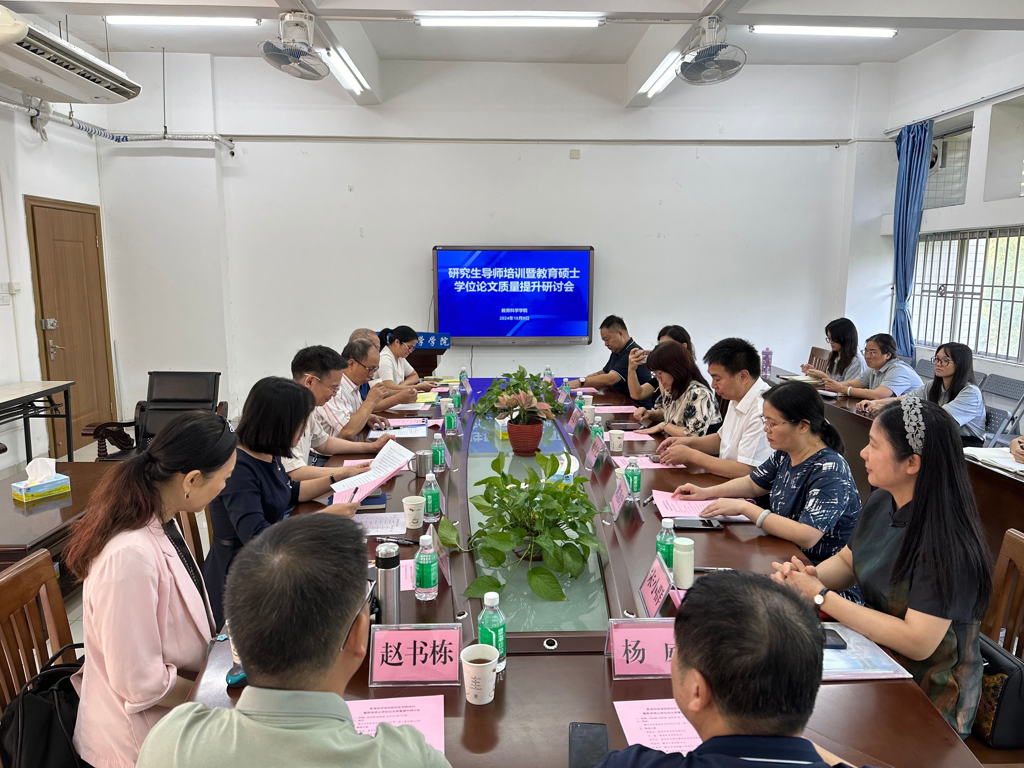 本网讯 近日,教育科学学院举办了研究生导师培训暨教育硕士学位论文质量提升研讨会。教育科学学院书记蔡振治、院长文雪、广东肇庆中学党委书记陈淑玲、肇庆中学附属小学校长张建华、肇庆中学附属幼儿园园长宋小群,深圳市光明区教育科学研究院副院长姚中化等行业导师代表,全体硕士生导师和2023级教育管理方向研究生参加了会议。