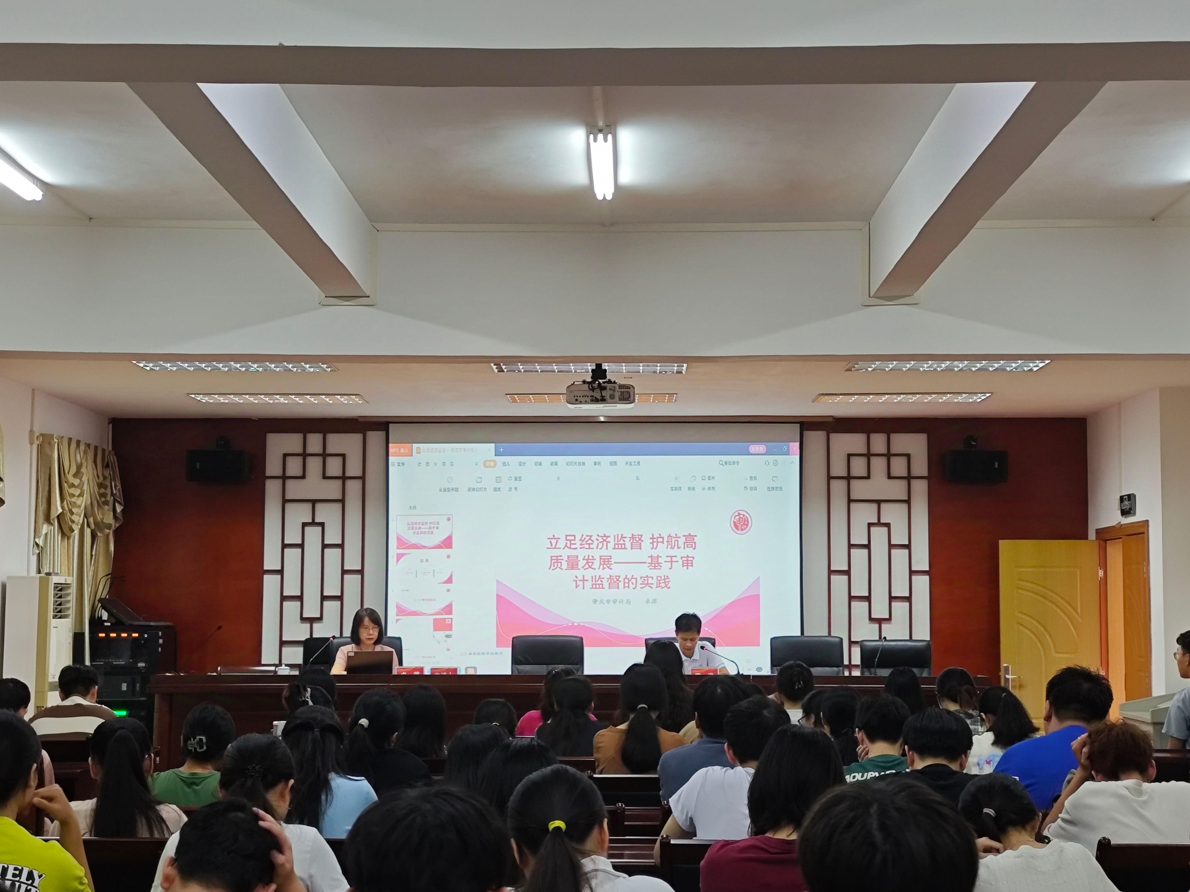 本网讯 10月18日,为进一步加深会计学专业学生对专业的认识,帮助同学们更快更准确地了解所学专业现状及发展前沿,激发同学们对本专业的热爱和学习动力,明确未来的职业发展方向,经济与管理学院邀请肇庆市审计局卓萍局长举办《立足经济监督 护航高质量发展--基于审计监督的实践》专题讲座。会计学专业学生100余人参加了讲座。