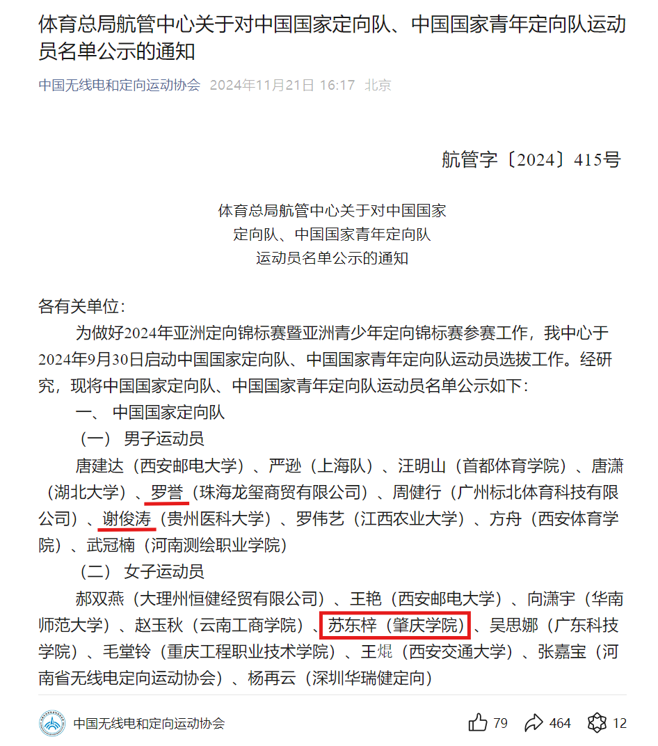 本网讯 近日,国家体育总局航空无线电模型运动管理中心发布了关于中国国家定向队和中国国家青年定向队运动员名单的公示,williamhill威廉希尔官网体育与健康学院2021级体育教育专业的苏东梓同学成功入选中国国家定向队,将代表中国队出征2024年亚洲定向运动锦标赛暨亚洲青少年定向锦标赛。此外,威廉希尔官网2012级校友罗誉和2014级校友谢俊涛也一同入选,为母校争得了荣誉。