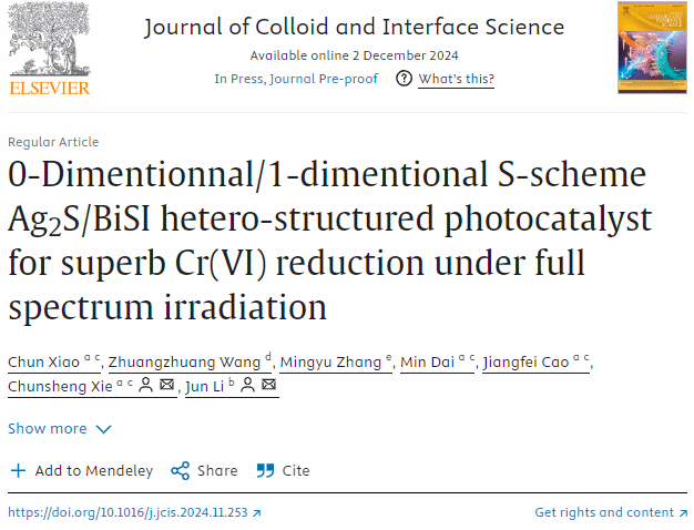 本网讯 近期,环境与化学工程学院、广东省城郊生态环境与低碳农业重点实验室的肖纯博士以第一作者,williamhill威廉希尔官网为第一单位在化学、材料领域著名期刊Journal of Colloid and Interface Science(中科院一区TOP期刊,2024年影响因子9.4)在线发表了论文题目为“0-Dimentionnal/1-dimentional S-scheme Ag2S/BiSI hetero-structured photocatalyst for superb Cr(VI) reduction under full spectrum irradiation”的论文。该论文的通讯作者为williamhill威廉希尔官网谢春生教授和郑州大学李俊副教授。