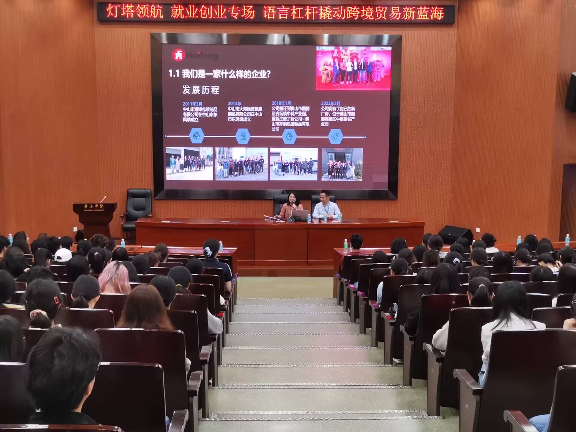 伍志锋以自身经历为切入点,开展主题为“商务英语人职业发展之路——语言杠杆撬动跨境贸易新蓝海”的就业创业分享会,讲述了她创业初期如何通过语言优势和个人沟通能力突破海外客户壁垒,并鼓励学弟学妹“以专业为支点,撬动跨境贸易新机遇”。赖科蓉以“与企业共成长”为主线,分享了从外贸新人成长为团队管理者的进阶之路,并通过自身的经历为在场学生讲述了商务英语专业在跨境贸易中的实际应用场景。