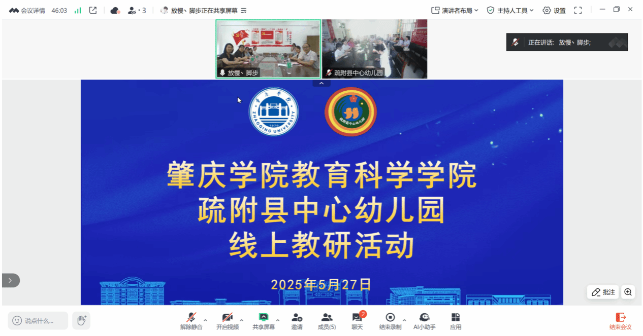 本网讯 5月27日,教育科学学院与疏附县中心幼儿园携手开展“云端共研,教学同行”教研活动。教科院党委书记蔡振治、副院长曾苗苗,疏附县中心幼儿园党支部书记石菲、园长帕提古丽·肉孜,教科院学前教育系教师,两地50名师生通过“线下+线上”形式参与活动。