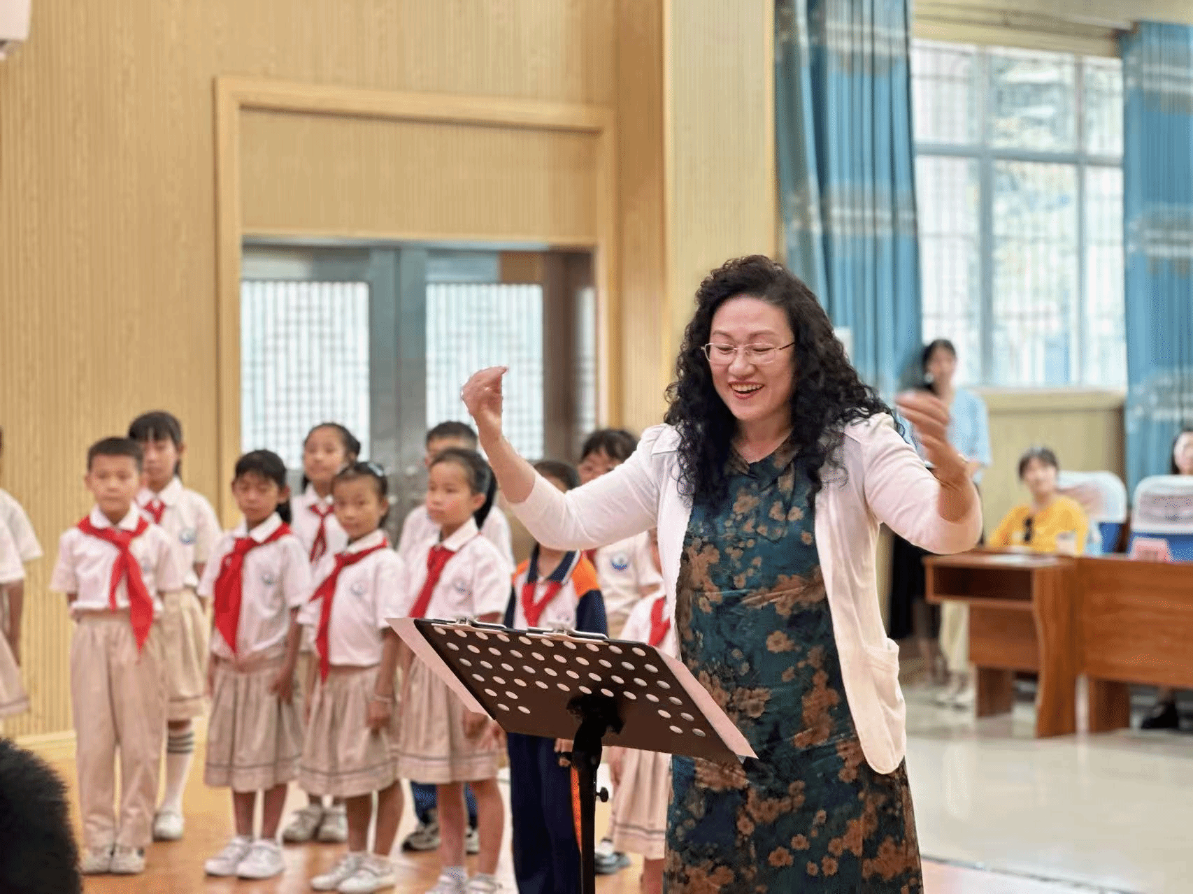 培训内容聚焦合唱排练技巧、声音塑造、站位调整及作品处理,苏严惠结合示范教学,强调声音和谐与情感表达,通过理论剖析与现场示范相结合的方式,为参训教师呈现了一堂生动而专业的合唱教学课,并针对基层教学实际提供优化建议。