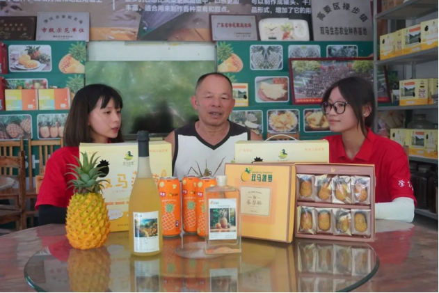 学院充分发挥食品与制药工程专业优势,通过“技术革新+深加工+新媒体营销”的模式,推动校地合作与科技成果转化。在双马村菠萝种植基地,“菠种希望·助力乡振”实践团与科技特派员吴秀兰副教授合作,通过田间直播推广“12(2)3技术”,展示菠萝酒、菠萝酥等深加工产品,吸引多名网友在线互动。团队还学习采摘技术,以实际行动助农增收。