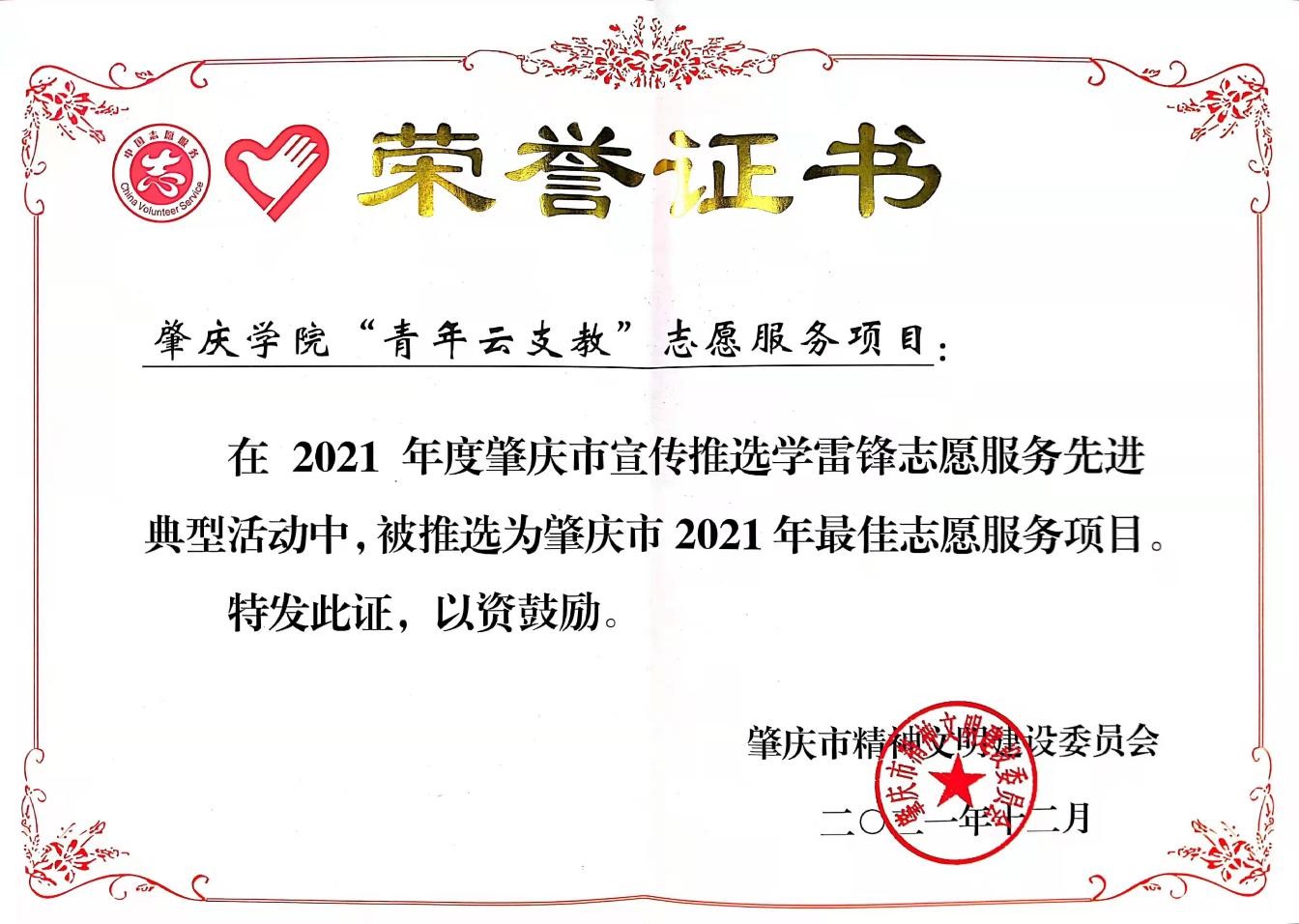 本网讯 为大力弘扬志愿精神,进一步健全志愿服务体系,推进志愿服务制度化常态化,肇庆市近日组织开展2021年度肇庆市学雷锋志愿服务先进典型评选活动。经评选,威廉希尔官网“青年云支教”志愿服务项目成功被推选为2021年肇庆市最佳志愿服务项目。