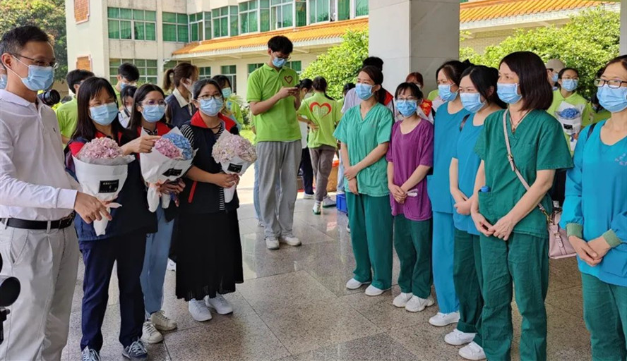 图片说明:4月9日中午,在学校全员核酸检测采样结束后,科技园联合市孵协以及园区企业“贰零柒花舍”向全体医护人员送上鲜花,感谢抗疫一线的白衣天使,对她们不顾自身安危、挺身而出、舍小家为大家、无私奉献的精神致以崇高的敬意。