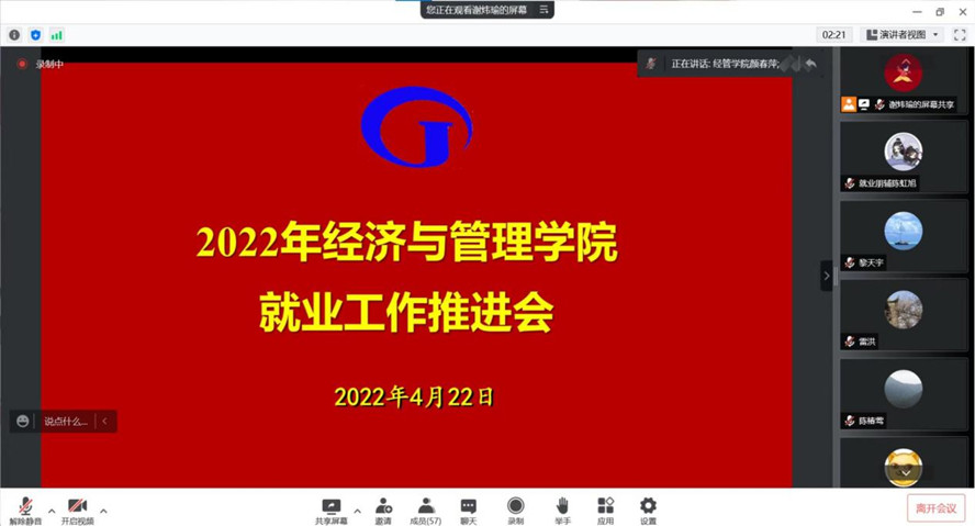 本网讯 4月22日,经济与管理学院以线上腾讯会议方式召开就业工作推进会,落实教育部和学校毕业生就业工作要求,扎实做好2022届毕业生就业工作。学院党政领导班子成员、全体教师参加。