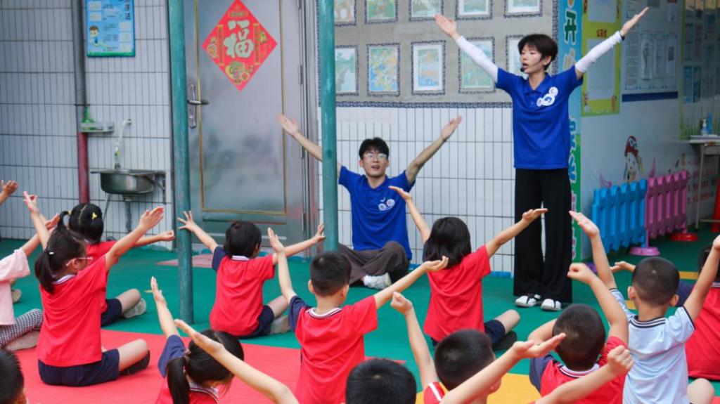 义教老师将义教课程分成“点燃童心红魂”“弘扬中华美育”和“幼小衔接启新征”三个主题。一是讲述《鸡毛信》中小英雄海娃热爱祖国、勇于抗争的革命故事和唱练“敢问天地试锋芒,披荆斩棘谁能挡”这一铿锵有力、充满正气的《少年中国说》武术操,让小朋友们接受红色文化熏陶,感受爱国主义情怀;二是以奥尔夫活动《太空小狮子》、美术活动《乘风破浪》和音乐活动《棒棒糖》,让小朋友们在课堂上感受艺术的乐趣,在活动里感悟中华美育的魅力;三是响应教育部以“幼小衔接 我们在行动”为主题的学前教育宣传月活动,组织开展幼儿升小学适应教育座谈会,帮助里洞镇幼儿园的大班幼儿向初等教育阶段迈进。