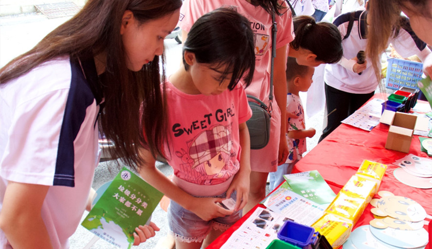 图为实践队员在跟小朋友一起做游戏,并正确引导小朋友进行垃圾投放