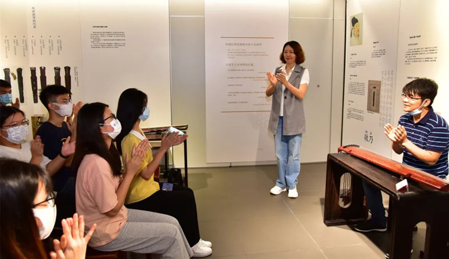 活动运用线上分享线下体验相结合的方式,带领学生深入了解二十四节气,传播优秀传统文化,增强文化自信。线上活动中,杨琼组织同学们积极参与讨论分享节气知识,同时结合生活实际,引导学生要顺应自然节律,体察自然之美。许嵩向同学们分享古琴知识,提高学生的审美素养。线下,杨琼带领学生们一同走进校博物馆,感受优秀传统文化。许嵩现场为同学们带来一堂精彩绝伦的古琴课,别开生面的知识传授,提升了学生对中华传统文化的认同感与自豪感。