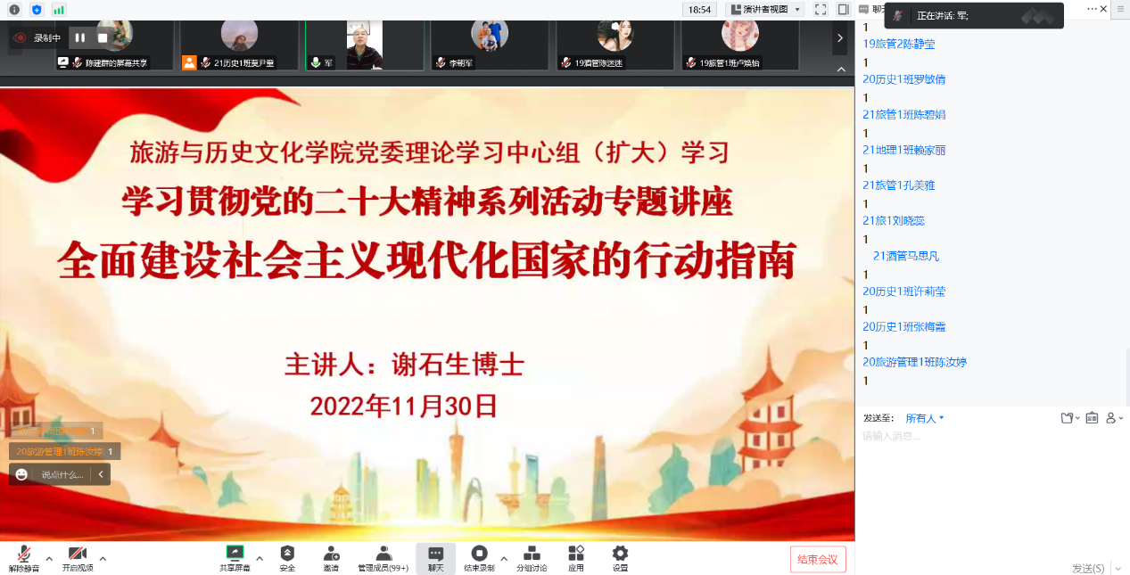 本次专题辅导邀请校宣讲团成员、马克思主义学院副教授谢石生博士,以《全面建设社会主义现代化国家的行动指南》为题带领师生深刻领会党的二十大主题和“三个务必”的根本政治要求。