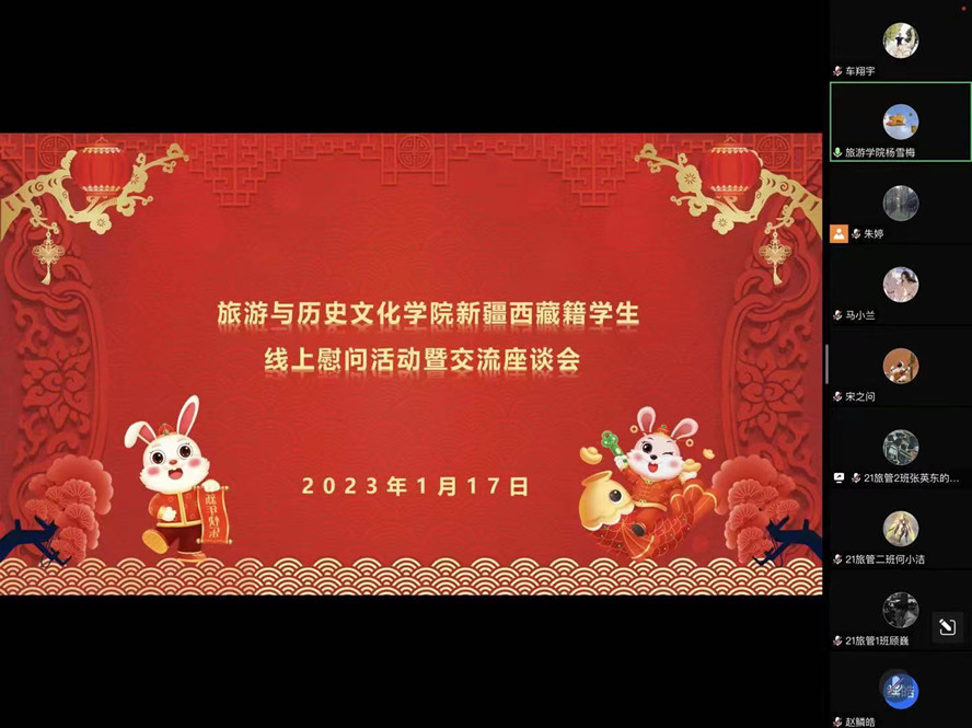 本网讯 瑞兔将至,情暖新春。1月17日,旅游学院线上举行新疆西藏籍学生新春慰问活动,了解同学们寒假期间的学习、生活情况并致以新春祝福。学院党委书记杨雪梅出席。