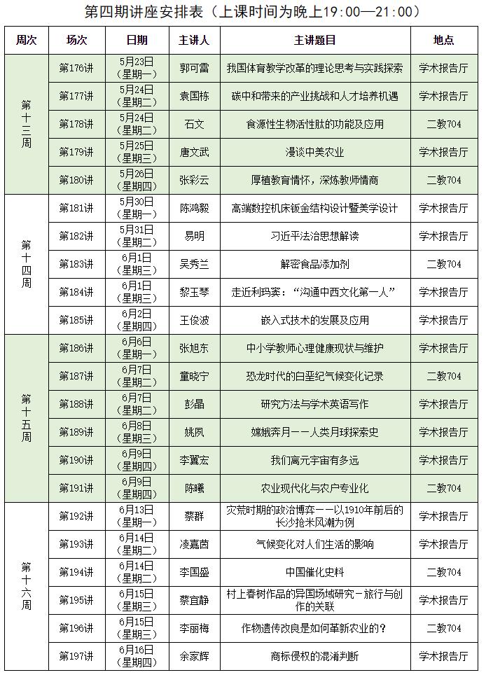 为推动学校通识教育改革,拓宽学生知识面,提高学生综合素质,促进学生成长成才。本学期开设75场讲座,分四期开出,第一期第1~4周、第二期第5~8周、第三期第9~12周、第四期第13~16周。现将第二期讲座的选课事宜通知如下:
