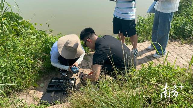 “四通清源·会绿兴粤”实践支队成员使用便携式检测仪器对绥江水质进行实地检测。