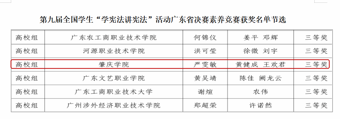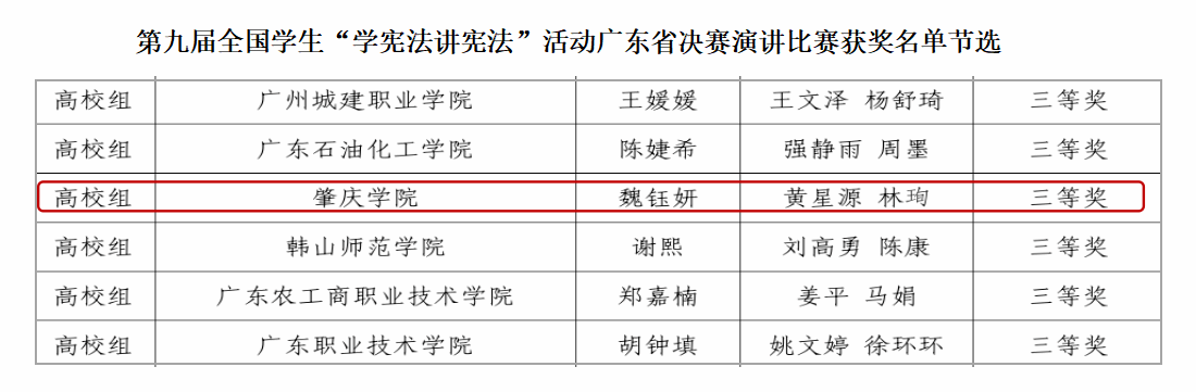 本网讯  为全面学习贯彻党的二十大精神,深入学习贯彻习近平法治思想,推动青少年宪法宣传教育常态化长效化,在省教育厅举办的第九届全省学生“学宪法 讲宪法”活动中,政法学院魏钰妍同学获得演讲比赛高校组三等奖,严雯敏同学获得素养竞赛高校组三等奖。