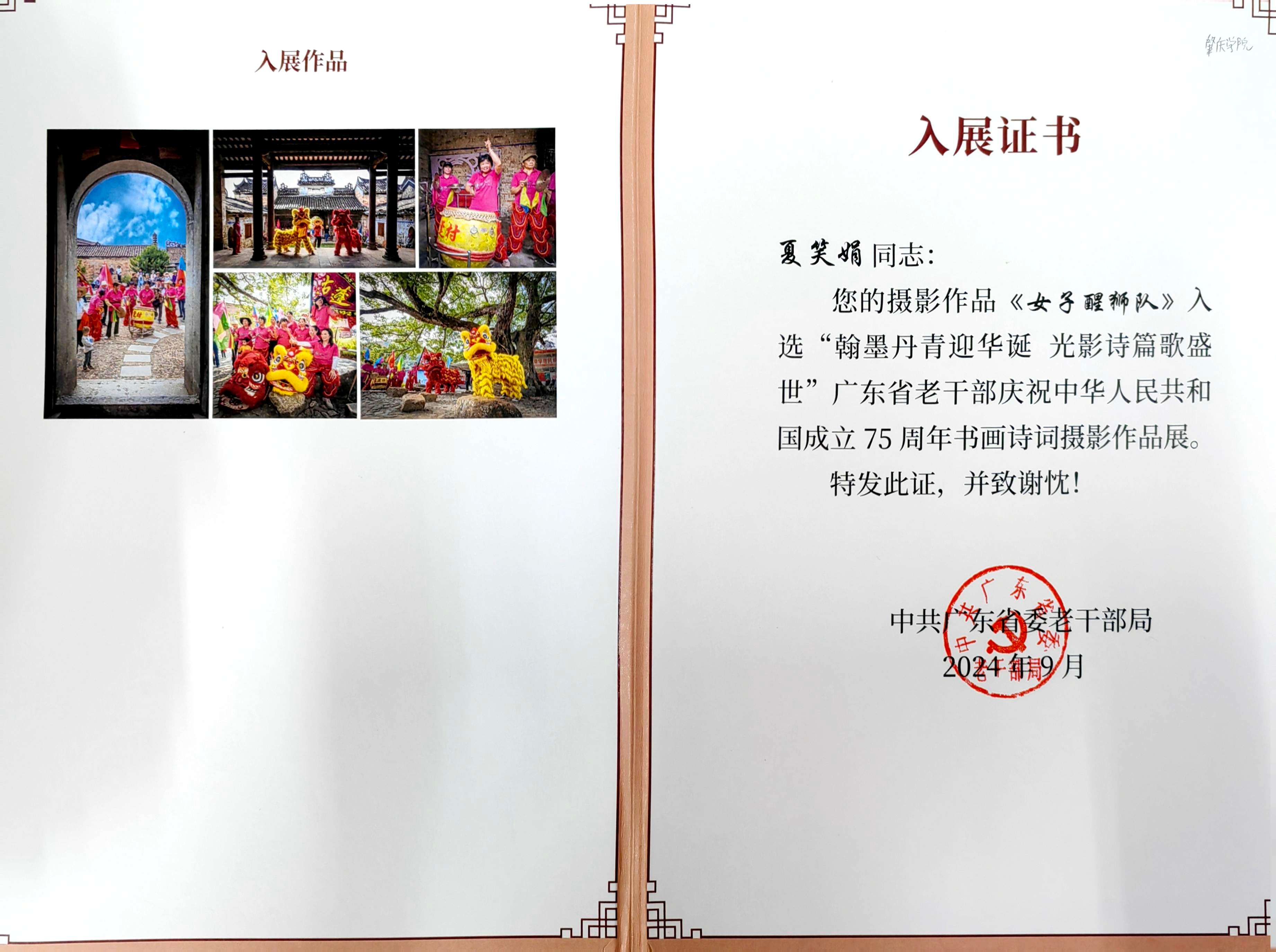 本网讯 近日,离退休党委传来喜讯,退休教工梁红敏、夏笑娟的摄影作品入选“翰墨丹青迎华诞 光影诗篇歌盛世”广东省老干部庆祝中华人民共和国成立75周年书画诗词摄影作品展并荣获入展证书。