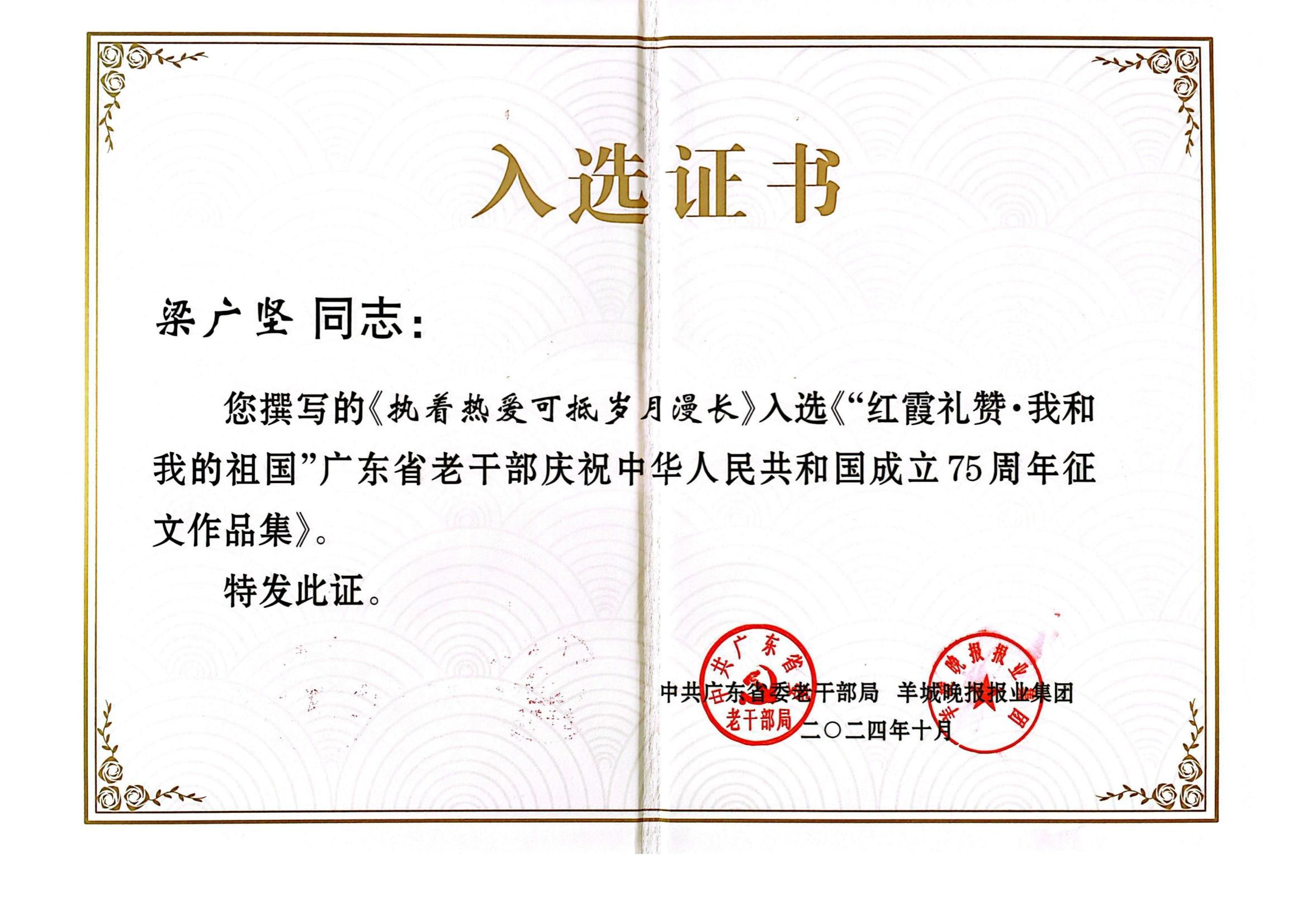 本网讯 近日,威廉希尔官网退休教师梁广坚教授的征文作品《执着热爱可抵岁月漫长》成功入选《“红霞礼赞·我和我的祖国”广东省老干部庆祝中华人民共和国成立75周年征文作品集》。